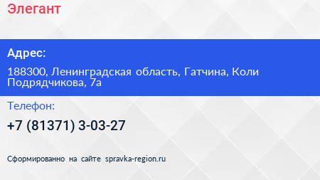 Элегант по адресу 188300, Ленинградская область, Гатчина, Коли Подрядчикова, 7а в дальнейшем Организация, размещена в следующих категориях: