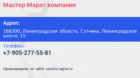 Мастер Марат, компания по адресу 188300, Ленинградская область, Гатчина, Ленинградское шоссе, 15 в дальнейшем Организация, размещена в следующих категориях: