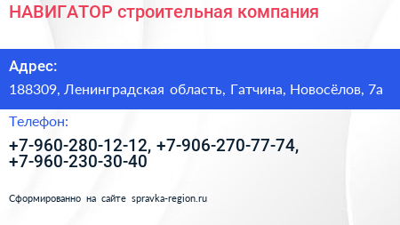 НАВИГАТОР, строительная компания по адресу 188309, Ленинградская область, Гатчина, Новосёлов, 7а в дальнейшем Организация, размещена в следующих категориях: