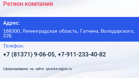 Регион, компания по адресу 188300, Ленинградская область, Гатчина, Володарского, 22Б в дальнейшем Организация, размещена в следующих категориях: