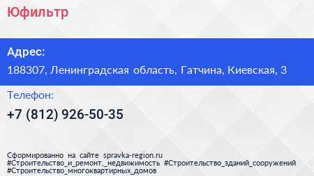 Юфильтр по адресу 188307, Ленинградская область, Гатчина, Киевская, 3 в дальнейшем Организация, размещена в следующих категориях:
