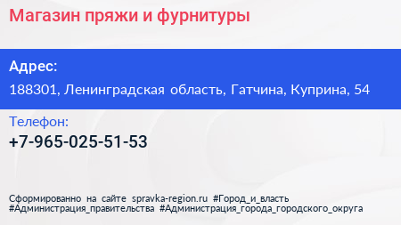 Магазин пряжи и фурнитуры по адресу 188301, Ленинградская область, Гатчина, Куприна, 54 в дальнейшем Организация, размещена в следующих категориях: