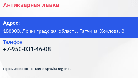 Антикварная лавка по адресу 188300, Ленинградская область, Гатчина, Хохлова, 8 в дальнейшем Организация, размещена в следующих категориях: