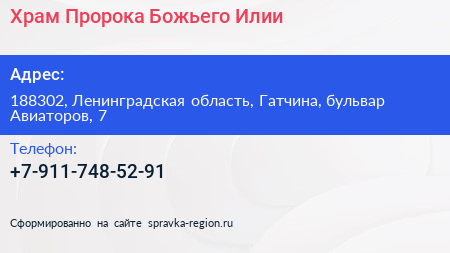 Храм Пророка Божьего Илии по адресу 188302, Ленинградская область, Гатчина, бульвар Авиаторов, 7 в дальнейшем Организация, размещена в следующих категориях: