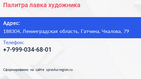 Палитра, лавка художника по адресу 188304, Ленинградская область, Гатчина, Чкалова, 79 в дальнейшем Организация, размещена в следующих категориях: