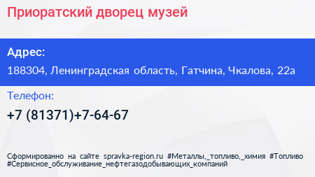 Приоратский дворец, музей по адресу 188304, Ленинградская область, Гатчина, Чкалова, 22а в дальнейшем Организация, размещена в следующих категориях: