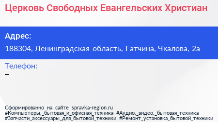 Церковь Свободных Евангельских Христиан по адресу 188304, Ленинградская область, Гатчина, Чкалова, 2а в дальнейшем Организация, размещена в следующих категориях: