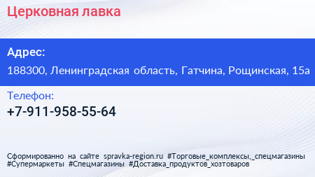 Церковная лавка по адресу 188300, Ленинградская область, Гатчина, Рощинская, 15а в дальнейшем Организация, размещена в следующих категориях: