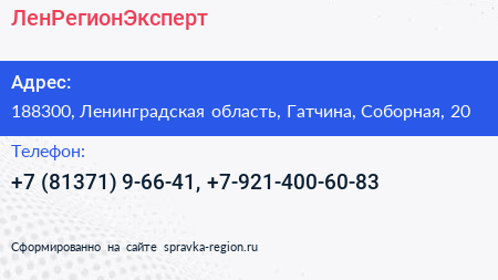 ЛенРегионЭксперт по адресу 188300, Ленинградская область, Гатчина, Соборная, 20 в дальнейшем Организация, размещена в следующих категориях: