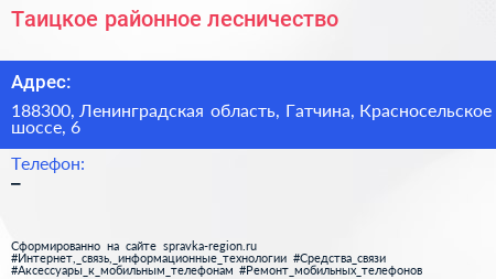 Таицкое районное лесничество по адресу 188300, Ленинградская область, Гатчина, Красносельское шоссе, 6 в дальнейшем Организация, размещена в следующих категориях: