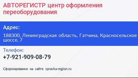 АВТОРЕГИСТР, центр оформления переоборудования по адресу 188300, Ленинградская область, Гатчина, Красносельское шоссе, 7 в дальнейшем Организация, размещена в следующих категориях: