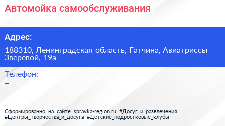 Автомойка самообслуживания по адресу 188310, Ленинградская область, Гатчина, Авиатриссы Зверевой, 19а в дальнейшем Организация, размещена в следующих категориях: