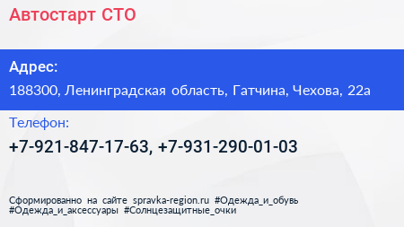 Автостарт, СТО по адресу 188300, Ленинградская область, Гатчина, Чехова, 22а в дальнейшем Организация, размещена в следующих категориях: