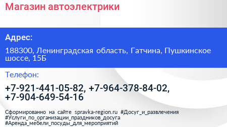 Магазин автоэлектрики по адресу 188300, Ленинградская область, Гатчина, Пушкинское шоссе, 15Б в дальнейшем Организация, размещена в следующих категориях: