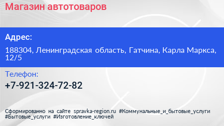 Магазин автотоваров по адресу 188304, Ленинградская область, Гатчина, Карла Маркса, 12/5 в дальнейшем Организация, размещена в следующих категориях: