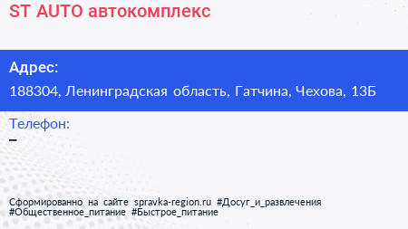 ST AUTO, автокомплекс по адресу 188304, Ленинградская область, Гатчина, Чехова, 13Б в дальнейшем Организация, размещена в следующих категориях:
