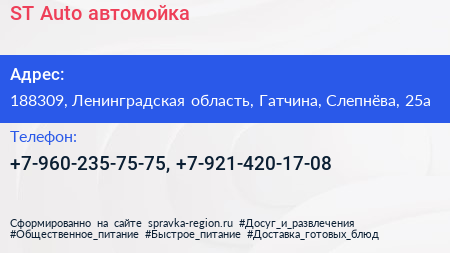 ST Auto, автомойка по адресу 188309, Ленинградская область, Гатчина, Слепнёва, 25а в дальнейшем Организация, размещена в следующих категориях: