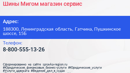 Шины Мигом, магазин-сервис по адресу 188300, Ленинградская область, Гатчина, Пушкинское шоссе, 15Б в дальнейшем Организация, размещена в следующих категориях: