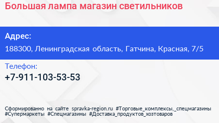 Большая лампа, магазин светильников по адресу 188300, Ленинградская область, Гатчина, Красная, 7/5 в дальнейшем Организация, размещена в следующих категориях: