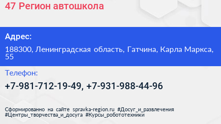 47 Регион, автошкола по адресу 188300, Ленинградская область, Гатчина, Карла Маркса, 55 в дальнейшем Организация, размещена в следующих категориях: