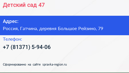 Детский сад №47 по адресу Детский сад № 15, Звёздная улица, Малое Рейзино, Большое Рейзино, Гатчинский муниципальный округ, Ленинградская область, Северо-Западный федеральный округ, 188301, Россия в дальнейшем Организация, размещена в следующих категориях: