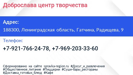 Доброслава, центр творчества по адресу 188300, Ленинградская область, Гатчина, Радищева, 9 в дальнейшем Организация, размещена в следующих категориях: