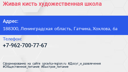 Живая кисть, художественная школа по адресу 188300, Ленинградская область, Гатчина, Хохлова, 6а в дальнейшем Организация, размещена в следующих категориях: