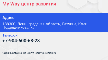My Way, центр развития по адресу 188300, Ленинградская область, Гатчина, Коли Подрядчикова, 7а в дальнейшем Организация, размещена в следующих категориях: