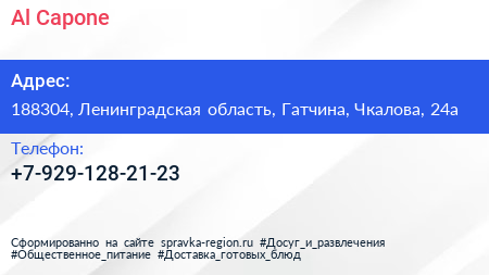 Al’Capone по адресу 188304, Ленинградская область, Гатчина, Чкалова, 24а в дальнейшем Организация, размещена в следующих категориях: