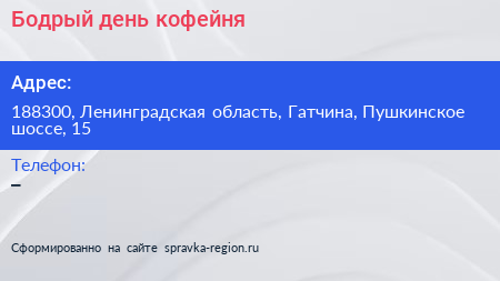 Бодрый день, кофейня по адресу 188300, Ленинградская область, Гатчина, Пушкинское шоссе, 15 в дальнейшем Организация, размещена в следующих категориях: