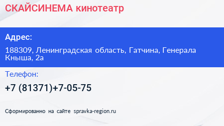 CКАЙСИНЕМА, кинотеатр по адресу 188309, Ленинградская область, Гатчина, Генерала Кныша, 2а в дальнейшем Организация, размещена в следующих категориях: