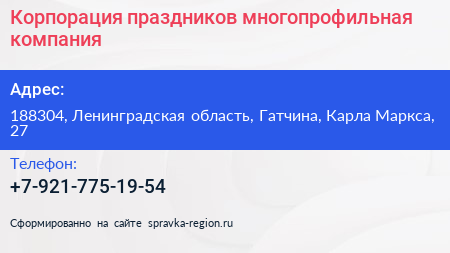Корпорация праздников, многопрофильная компания по адресу 188304, Ленинградская область, Гатчина, Карла Маркса, 27 в дальнейшем Организация, размещена в следующих категориях: