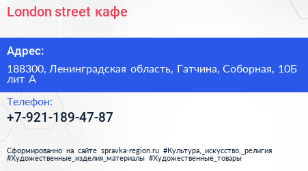London street, кафе по адресу 188300, Ленинградская область, Гатчина, Соборная, 10Б лит А в дальнейшем Организация, размещена в следующих категориях:
