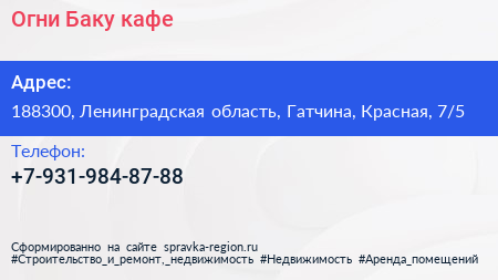 Огни Баку, кафе по адресу 188300, Ленинградская область, Гатчина, Красная, 7/5 в дальнейшем Организация, размещена в следующих категориях: