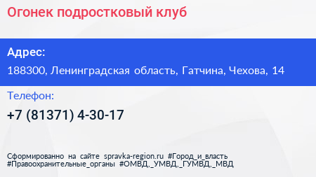 Огонек, подростковый клуб по адресу 188300, Ленинградская область, Гатчина, Чехова, 14 в дальнейшем Организация, размещена в следующих категориях:
