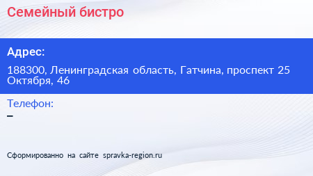 Семейный, бистро по адресу 188300, Ленинградская область, Гатчина, проспект 25 Октября, 46 в дальнейшем Организация, размещена в следующих категориях: