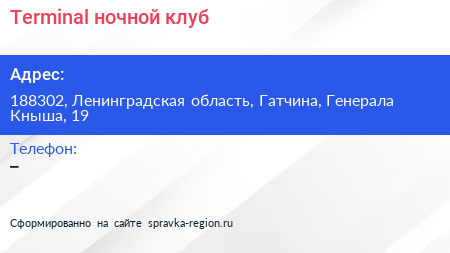 Terminal, ночной клуб по адресу 188302, Ленинградская область, Гатчина, Генерала Кныша, 19 в дальнейшем Организация, размещена в следующих категориях:
