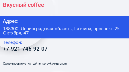 Вкусный coffee по адресу 188300, Ленинградская область, Гатчина, проспект 25 Октября, 47 в дальнейшем Организация, размещена в следующих категориях: