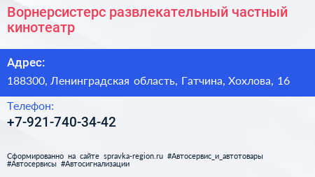 Ворнерсистерс, развлекательный частный кинотеатр по адресу 188300, Ленинградская область, Гатчина, Хохлова, 16 в дальнейшем Организация, размещена в следующих категориях: