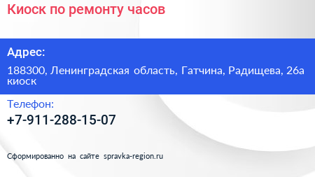 Киоск по ремонту часов по адресу 188300, Ленинградская область, Гатчина, Радищева, 26а киоск в дальнейшем Организация, размещена в следующих категориях: