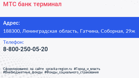 МТС банк, терминал по адресу 188300, Ленинградская область, Гатчина, Соборная, 29ж в дальнейшем Организация, размещена в следующих категориях: