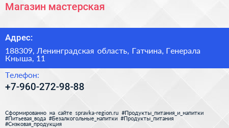 Магазин-мастерская по адресу 188309, Ленинградская область, Гатчина, Генерала Кныша, 11 в дальнейшем Организация, размещена в следующих категориях: