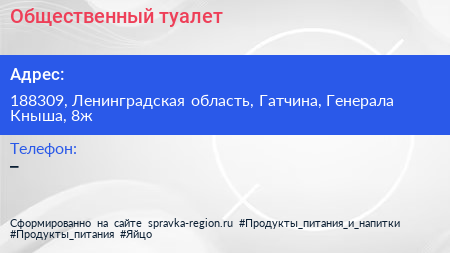 Общественный туалет по адресу 188309, Ленинградская область, Гатчина, Генерала Кныша, 8ж в дальнейшем Организация, размещена в следующих категориях: