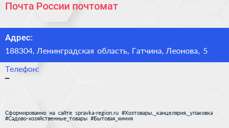 Почта России, почтомат по адресу 188304, Ленинградская область, Гатчина, Леонова, 5 в дальнейшем Организация, размещена в следующих категориях: