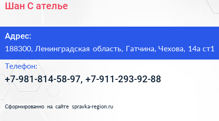 Шан`С, ателье по адресу 188300, Ленинградская область, Гатчина, Чехова, 14а ст1 в дальнейшем Организация, размещена в следующих категориях: