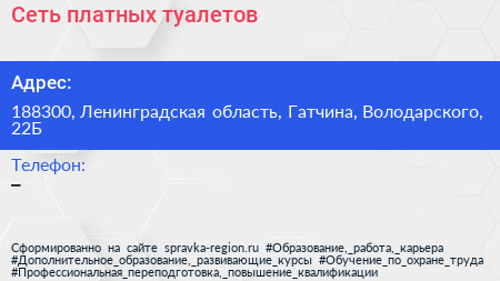 Сеть платных туалетов по адресу 188300, Ленинградская область, Гатчина, Володарского, 22Б в дальнейшем Организация, размещена в следующих категориях:
