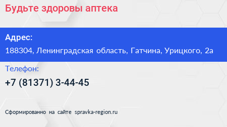 Будьте здоровы, аптека по адресу 188304, Ленинградская область, Гатчина, Урицкого, 2а в дальнейшем Организация, размещена в следующих категориях: