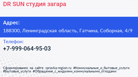 DR SUN, студия загара по адресу 188300, Ленинградская область, Гатчина, Соборная, 4/9 в дальнейшем Организация, размещена в следующих категориях: