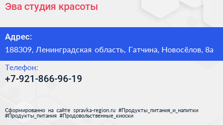 Эва, студия красоты по адресу 188309, Ленинградская область, Гатчина, Новосёлов, 8а в дальнейшем Организация, размещена в следующих категориях: