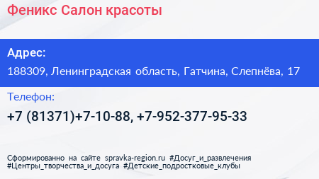 Феникс, Салон красоты по адресу 188309, Ленинградская область, Гатчина, Слепнёва, 17 в дальнейшем Организация, размещена в следующих категориях: